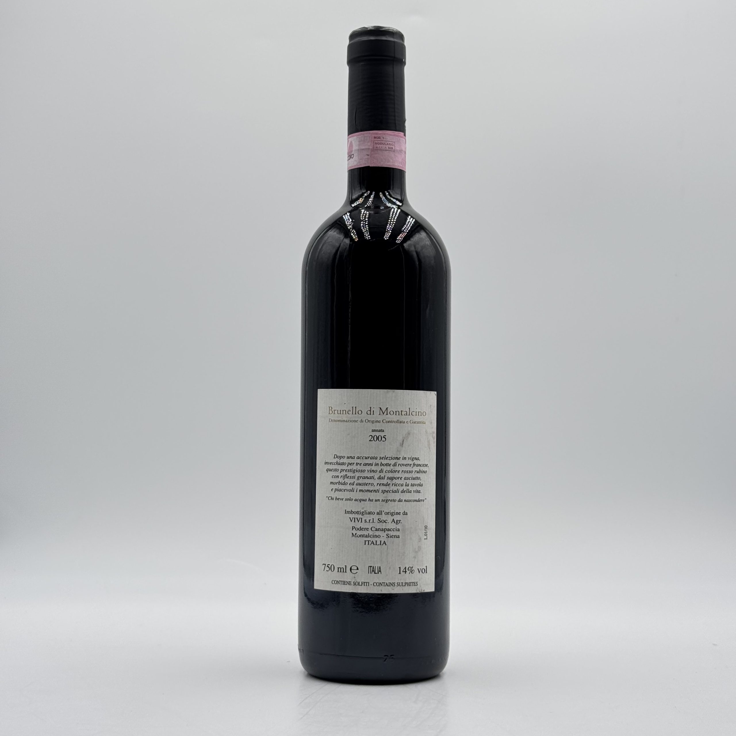 Il Brunello di Montalcino Podere Canapaccia 2005 è un vino di rara eleganza, espressione autentica del territorio toscano e della sua straordinaria vocazione enologica. Prodotto esclusivamente da uve Sangiovese Grosso, questo Brunello racchiude in sé la ricchezza aromatica e la profondità che solo le grandi annate sanno regalare. Dopo un lungo affinamento in botti di rovere e successivamente in vetro, il 2005 si presenta con un colore granato intenso, dai riflessi caldi e luminosi. Al naso emergono profumi complessi di ciliegia sotto spirito, spezie fini, cuoio, tè nero e delicate note balsamiche. Il sorso è armonioso, equilibrato tra freschezza e struttura, con tannini setosi e un finale persistente che richiama sentori di frutti rossi e spezie dolci. È un vino maturo, da degustare oggi nella sua piena espressione o da conservare ancora per momenti di pura contemplazione. Perfetto con piatti di selvaggina, brasati o formaggi stagionati, il Brunello di Montalcino Podere Canapaccia 2005 rappresenta un’autentica icona di eleganza e tradizione toscana.