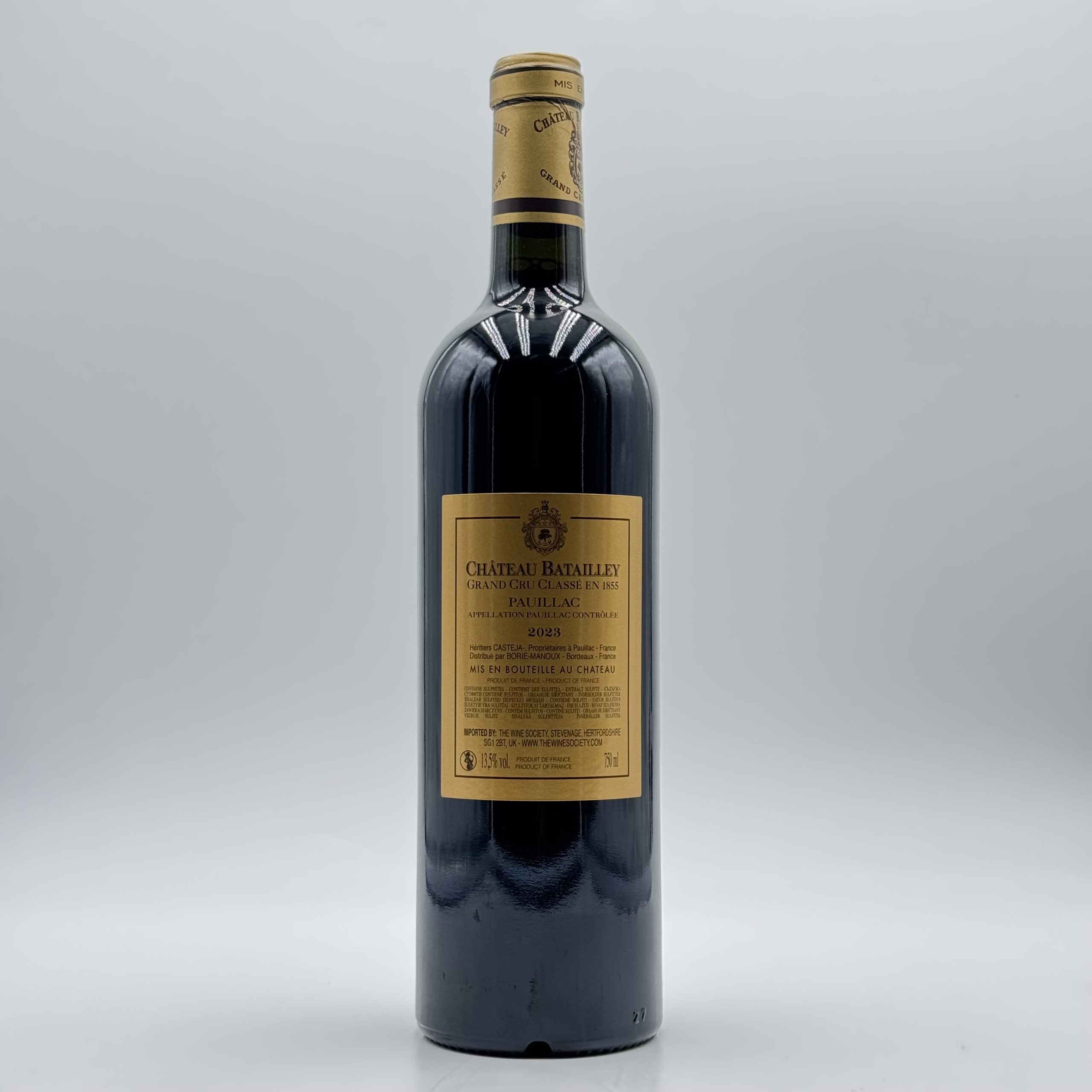 Château Batailley 2023 è un prestigioso vino rosso di Pauillac, una delle denominazioni più celebri del Médoc, a Bordeaux. Questo Grand Cru Classé del 1855 esprime con eleganza e precisione il carattere del suo straordinario terroir ghiaioso affacciato sull’estuario della Gironda. L’annata 2023 si distingue per equilibrio, struttura e finezza aromatica. Al naso emergono intense note di ribes nero, mora e prugna, accompagnate da eleganti sfumature di grafite, cedro e spezie dolci. Al palato è profondo e armonioso, con tannini setosi, grande concentrazione e una freschezza che ne sostiene la lunga persistenza. L’affinamento in barrique di rovere francese conferisce complessità e raffinate note tostate. Perfetto in abbinamento a carni rosse, selvaggina e formaggi stagionati, Château Batailley 2023 è un Bordeaux di grande classe, ideale sia per il consumo immediato sia per un lungo affinamento in cantina. Un vino iconico per gli amanti dei grandi Pauillac e delle etichette storiche di Bordeaux.