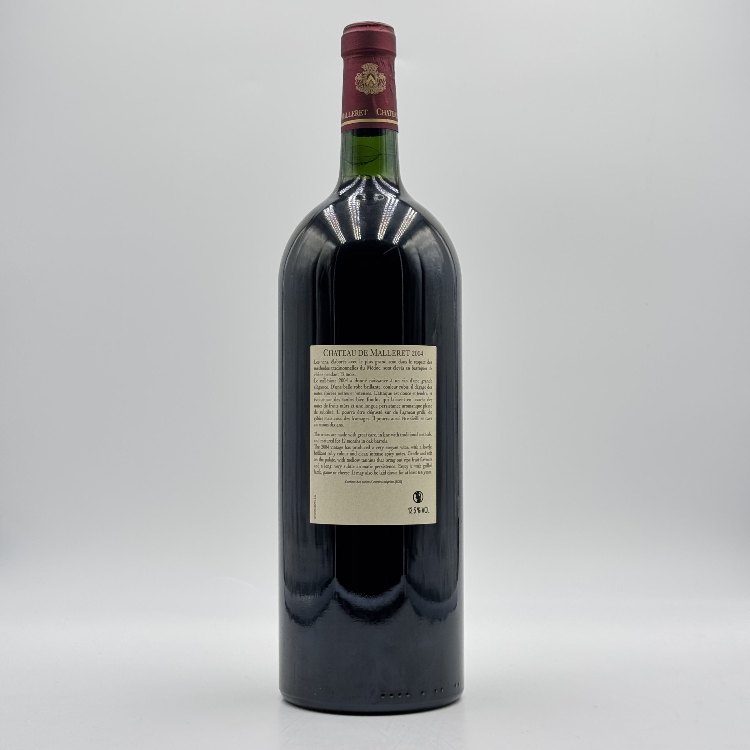 Il Clos de Malleret Haut-Médoc Rouge 2004 Magnum è un Bordeaux maturo di grande fascino, capace di esprimere tutta l’eleganza e la complessità tipiche della riva sinistra. Proveniente da un’annata equilibrata, questo vino si presenta oggi in una fase evolutiva ideale, con un profilo raffinato e armonioso. Al naso emergono note di frutta rossa matura, prugna e ribes, accompagnate da sentori terziari di cuoio, tabacco, sottobosco e spezie dolci. Il formato magnum favorisce un’evoluzione più lenta, preservando freschezza e integrità aromatica. Al palato è morbido e avvolgente, con tannini levigati e una struttura elegante che conduce a un finale lungo e persistente. Perfetto in abbinamento a carni arrosto, selvaggina e formaggi stagionati, è una scelta ideale per intenditori e per occasioni speciali.