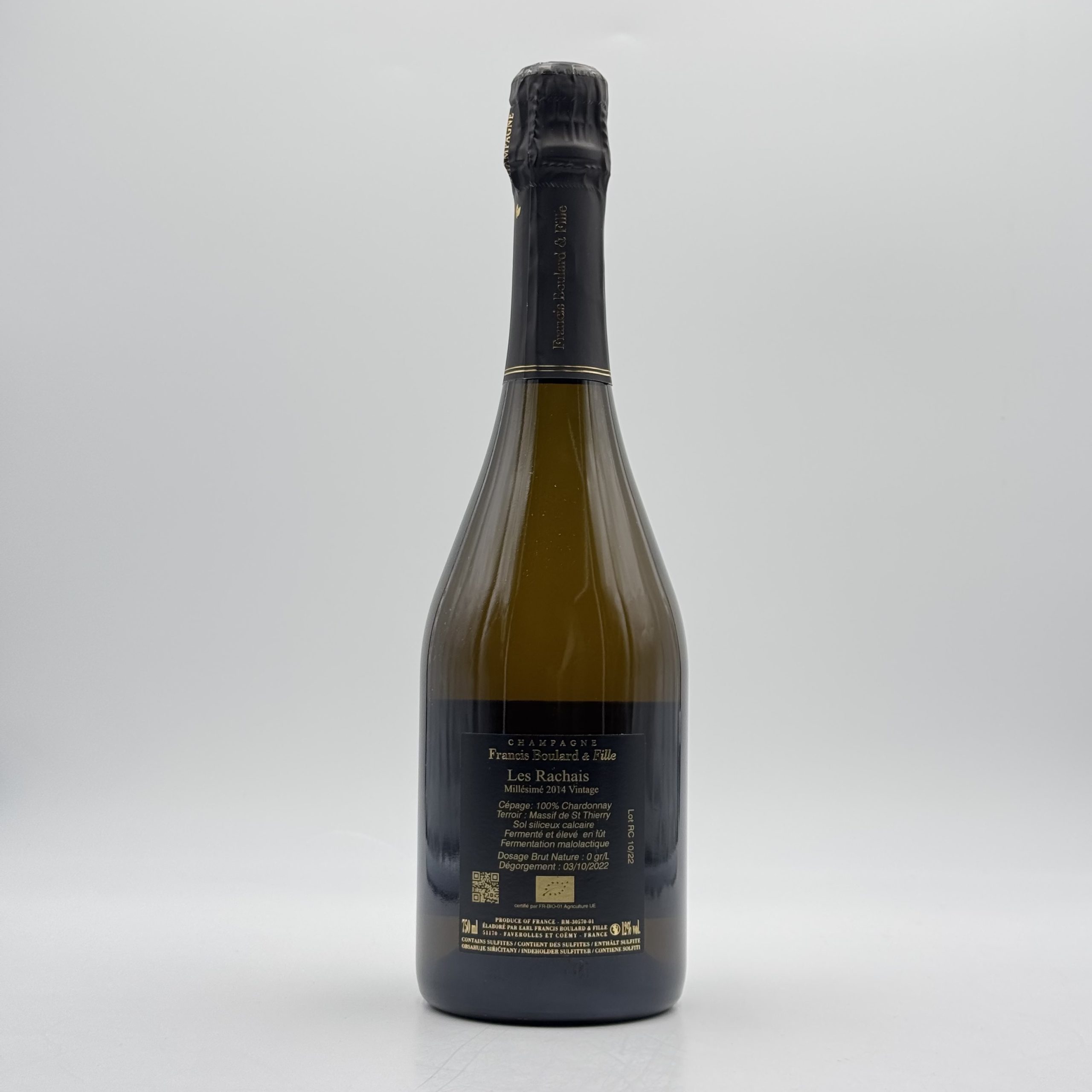 ll Francis Boulard Les Rachais 2014 è uno Champagne di grande personalità, espressione autentica di un terroir d’eccellenza e di una filosofia produttiva orientata alla qualità assoluta. Proveniente da parcelle selezionate e coltivate secondo principi sostenibili, questo millesimato rappresenta un perfetto equilibrio tra tradizione artigianale e raffinatezza moderna. Alla vista si presenta luminoso, con un perlage fine e persistente. Il bouquet è ampio e complesso, caratterizzato da eleganti note di agrumi canditi, frutta secca, mela matura, fiori bianchi e delicate sfumature minerali e tostate. Al palato è profondo, strutturato e armonioso, con una freschezza vibrante che sostiene una lunga e raffinata persistenza gustativa. L’annata 2014 conferisce a questo Champagne grande precisione espressiva, rendendolo ideale per intenditori e collezionisti. Perfetto in abbinamento a piatti di alta cucina, crostacei, tartare di pesce, carni bianche e formaggi stagionati, il Francis Boulard Les Rachais 2014 è una scelta di prestigio per chi desidera vivere un’esperienza enologica esclusiva e memorabile.