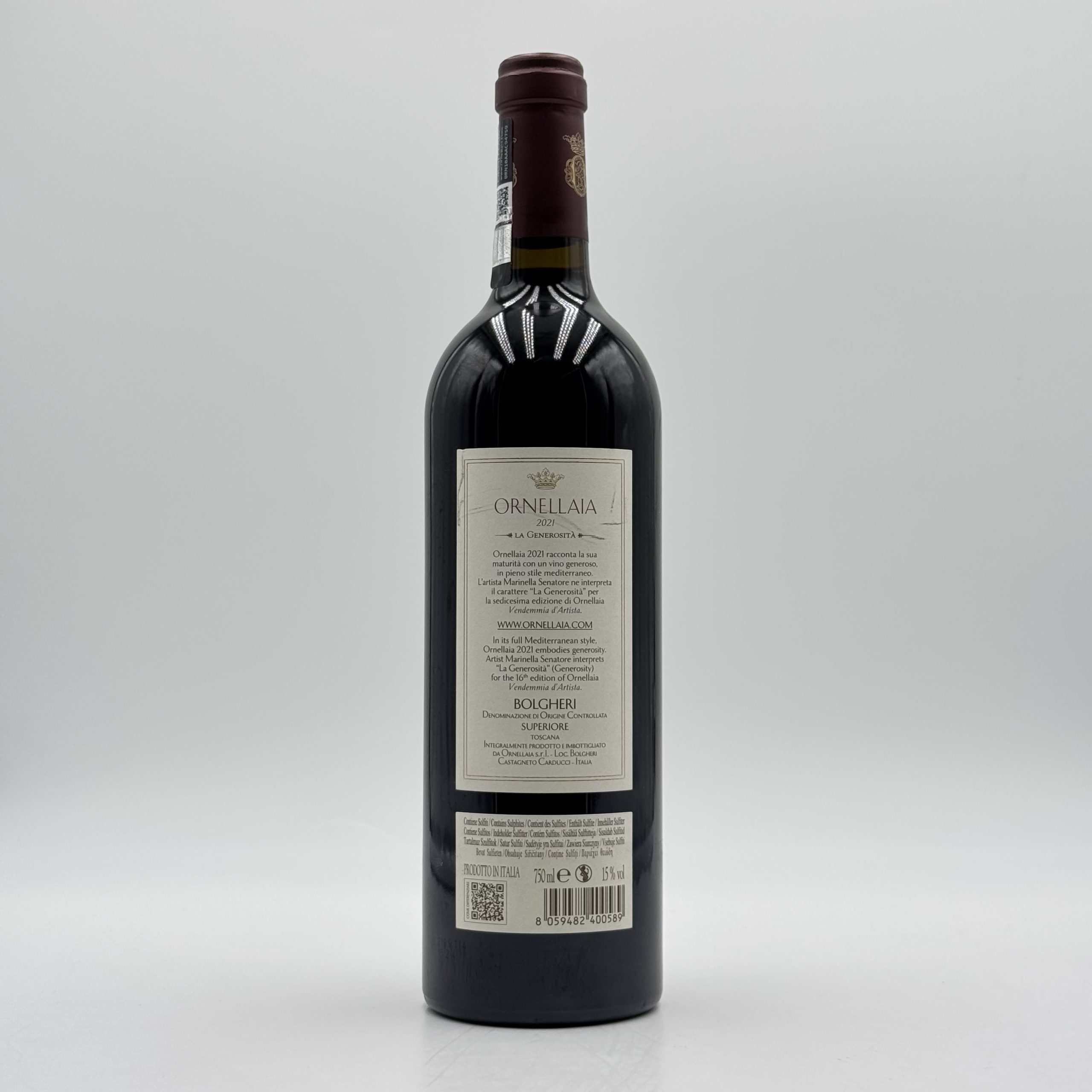 Ornellaia 2021 Magnum è un’icona dell’eccellenza enologica italiana, simbolo della straordinaria qualità del Bolgheri DOC Superiore. In questa preziosa versione Magnum, il vino esprime ancora più intensità ed eleganza, grazie alla lenta evoluzione in bottiglia e al perfetto equilibrio tra potenza e finezza. Il bouquet è ricco e complesso: frutti neri maturi, ciliegia, mora e ribes si intrecciano a note di cacao, vaniglia, spezie dolci e leggere sfumature balsamiche. Al palato si presenta strutturato e vellutato, con tannini setosi e una persistenza lunga e armoniosa.