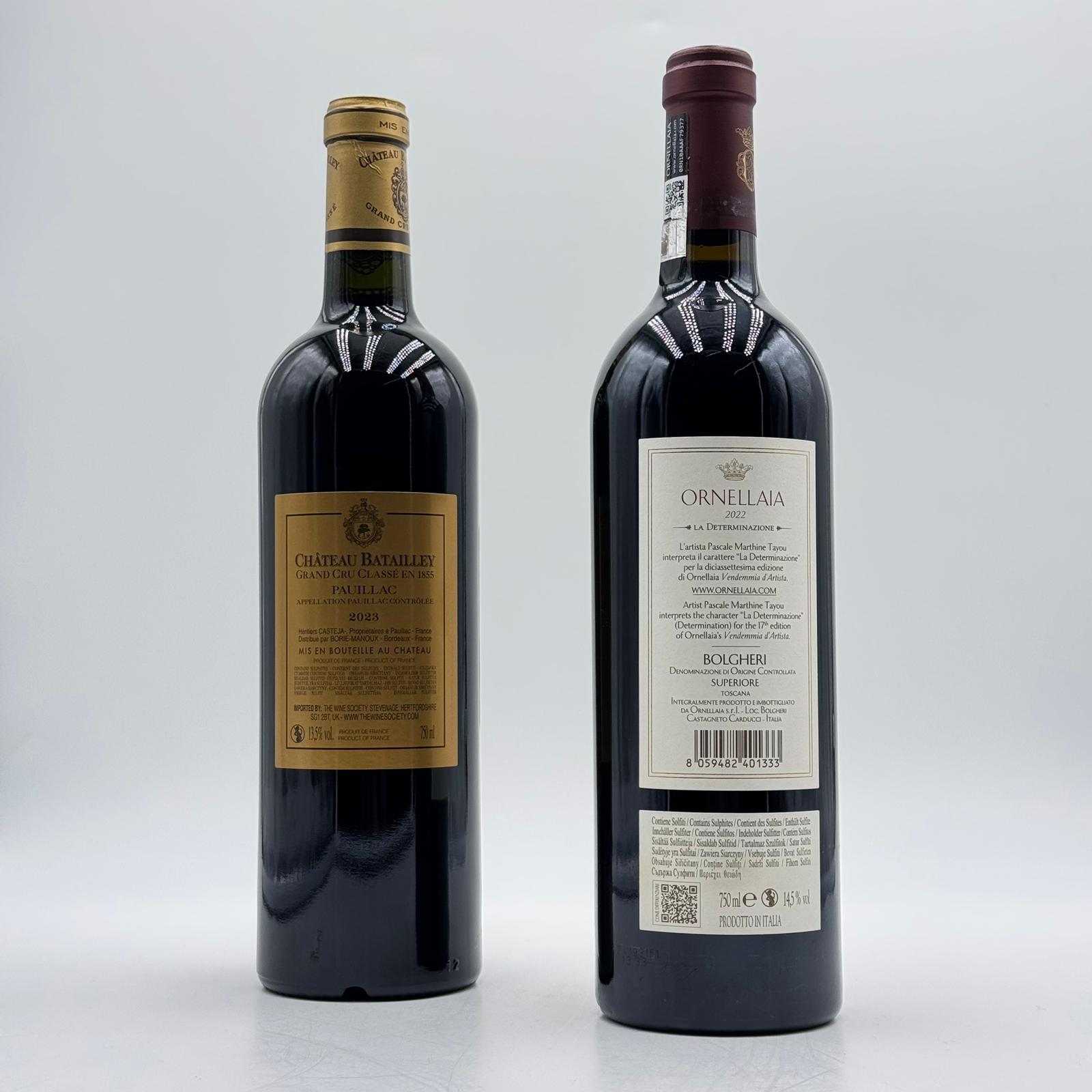 Una selezione che riunisce due grandi icone dell’enologia europea: Ornellaia 2022 e Château Batailley 2023, espressioni autentiche di due territori straordinari come Bolgheri e Pauillac.